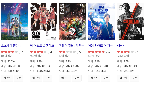1월 초 개봉작인데 아직도 2위에 머무르고 있습니다. 슬램덩크에 열광하던 세대가 어른이 되어 마음껏 즐길 수 있어서 일까요?