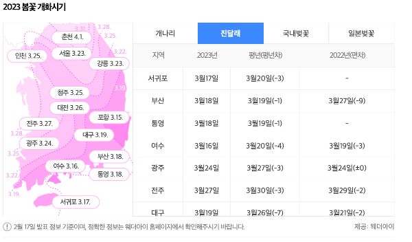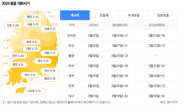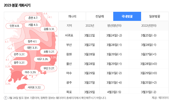 오늘은 봄의 손님들, 꽃들의 개화시기를 알아보도록 하겠습니다.