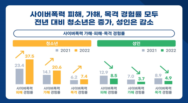 국내 청소년 사이버폭력 경험률(가해·피해·목격 경험)은 41.6%로 2021년 조사 대비 12.4%p 증가한 반면, 성인의 사이버폭력 경험률은 9.6%로 전년도 대비 6.2%p 감소했다고 합니다.